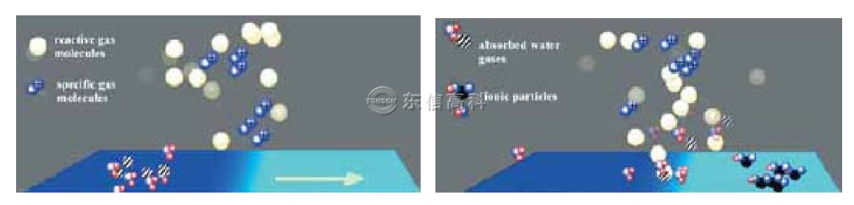 圖2 ?- 在外場影響下,反應氣體向表面擴散。從表面上敲下低分子量材料,例如水,吸收的氣體和聚合物碎片,以暴露出清潔,新鮮的表面。 同時,等離子體中的一定百分比的反應性組分具有足夠的能量結合到膜的新暴露部分,改變表面的化學性質并賦予所需的功能性。